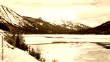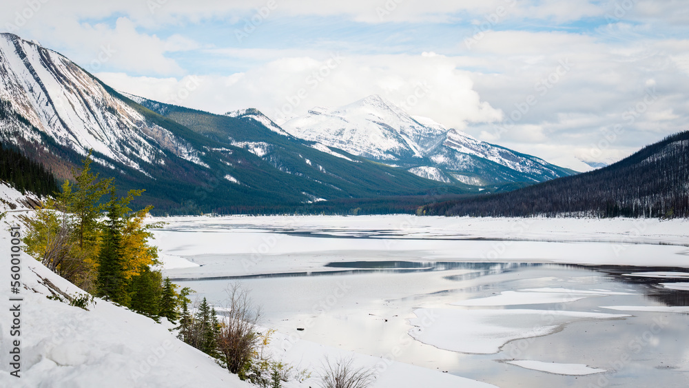 Snow and ice covered Medicine Lake in Jasper National Park, Canadian Rockies. Canada.