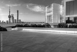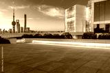 Empty square floor and city skyline with modern buildings at sunrise in Shanghai, China.