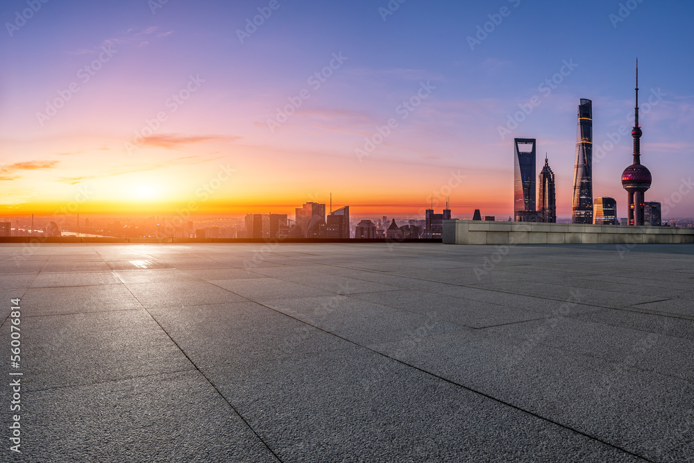 Empty square floor and city skyline with modern buildings at sunrise in Shanghai, China.