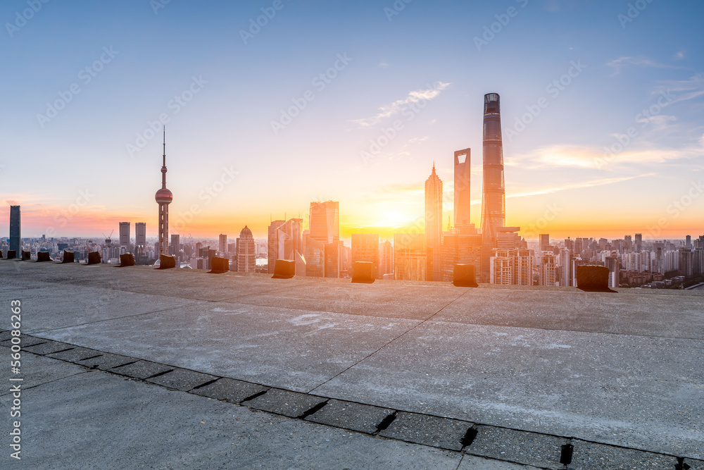 Empty concrete road and city skyline with modern buildings at sunrise in Shanghai, China.