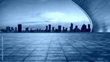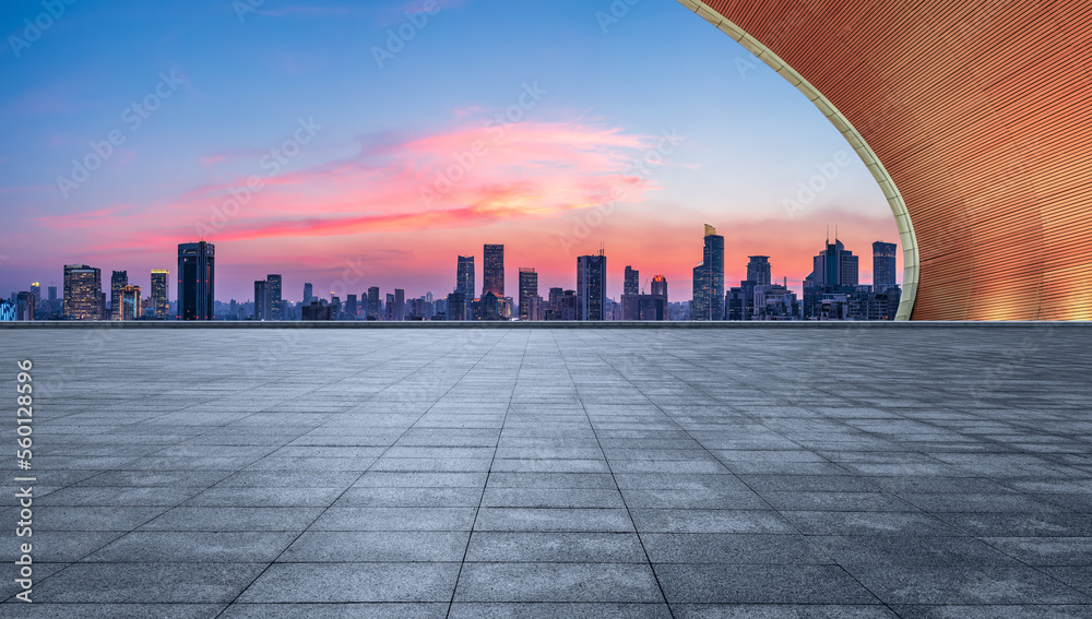 Empty square floor and city skyline with modern buildings at sunset in Shanghai, China.