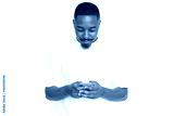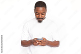 Concentrated young man typing message on smartphone. Male African American model with brown eyes, short haircut and beard in white T-shirt using smartphone reading news. Modern technology concept