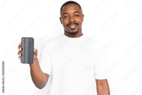 Joyful young man presenting smartphone. Male African American model with brown eyes, short haircut and beard in white T-shirt showing smartphone screen. Advertising, modern technology concept