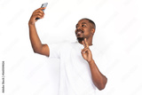 Cheerful young man taking selfie showing peace sign. Male African American model with brown eyes, short haircut and beard in casual clothes taking self-portrait. Self-assurance, lifestyle concept