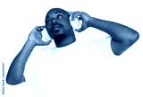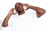 Dreamy young man listening to music in headphones. Male African American model with brown eyes, short haircut and beard in casual clothes wearing headphones enjoying music. Lifestyle, music concept