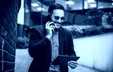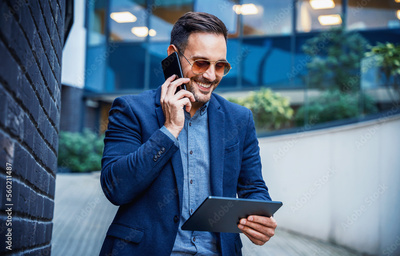 Business people. Businessman holding tablet and making a phone call in front of the corporation. Business, lifestyle concept