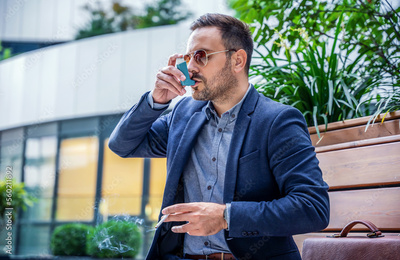 Smoking, stress and asthma. Young businessman treating asthma attack with inhaler. Health care concept