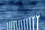 Set of wrench tools on wooden background. Top view, copy space