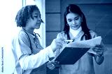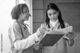 Nurse student Multi-ethnic group of happy nursing students talking medical university corridor.