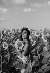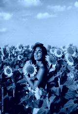 A beautiful Ukrainian girl, standing in a field of sunflowers, wrapped in her national flag, the flag of Ukraine. No war in Ukraine