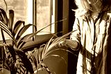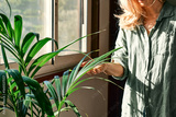 Hand of woman touching green leaves of Kentia houseplants. Moisturize leaves of tropical plants during the heating season at home. Greenery at home. Eco-friendly life. Taking care of plants, hobby.