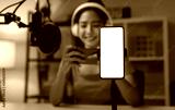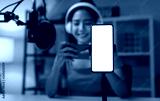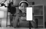 Cheerful beautiful Asian woman wearing headphones with live streaming on mobile and smartphone mockup of blank screen for application.