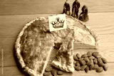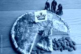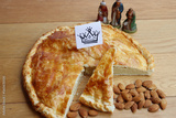 Galette des rois, traditional french cake with almond cream on wooden table. Epiphany cake with figure of three kings