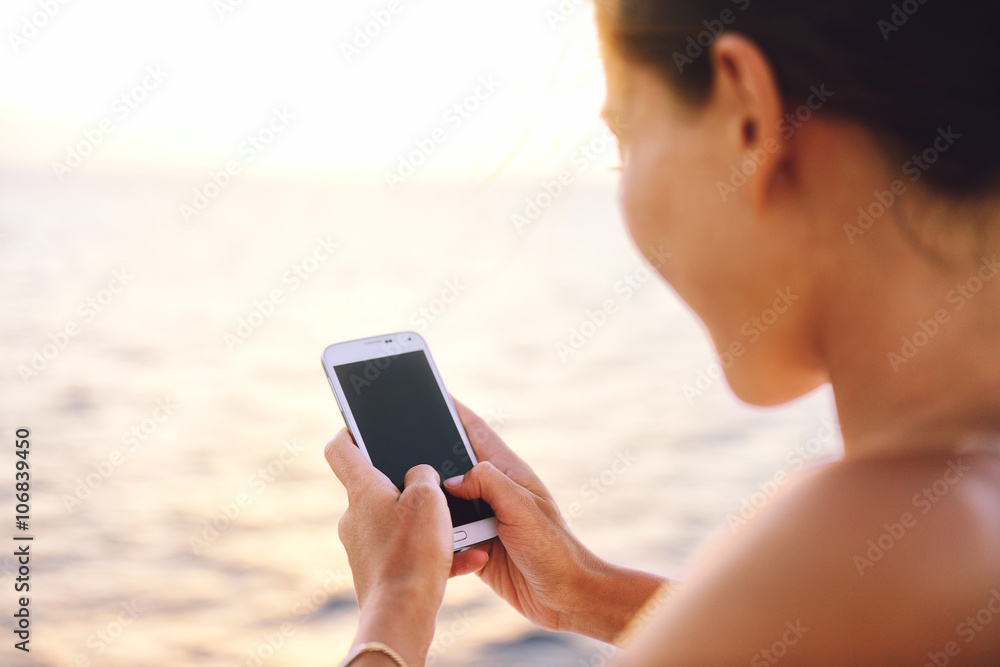 Studio shot of cheerful beautiful Asian woman in t-shirt and stand with smile on screen background, PNG transparent.