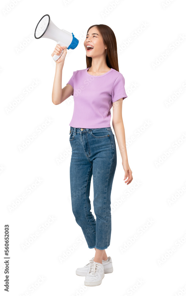 Smile Asian woman holding megaphone with shout something to the customer on screen background, PNG transparent.