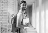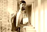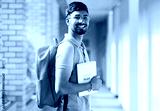 College student portrait, happy man and walking at university with a tablet and backpack to study and learn. Gen z male happy about education, learning and future after studying at school building