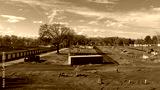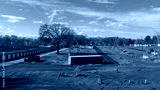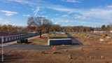 Storage units warehouse near under construction mobile home park with manufactured houses and slab foundation works in Rochester, New York, USA
