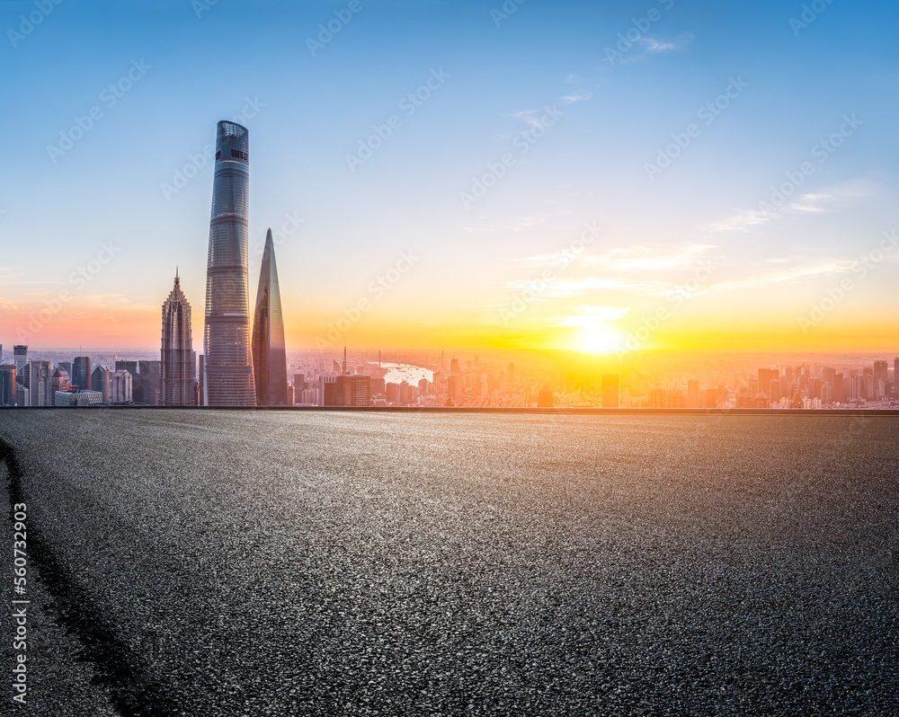 Asphalt road and city skyline with modern buildings at sunrise in Shanghai, China.