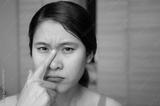 Portrait of unhappy Asian woman pointing to an acne occur between her eyebrows. Allergies, irritants, genetic makeup, etc can cause skin conditions.