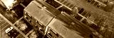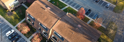 Panorama aerial view three story barn style house apartment complex with outdoor parking and colorful fall foliage in early morning light in Penfield, New York, USA