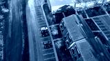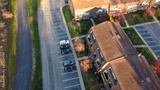 Aerial view three story barn style house apartment complex with outdoor parking and colorful fall foliage in early morning light in Penfield, New York, USA