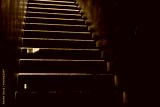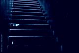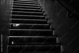 Stairwell, emergency exit in a block of flats. Indoor staircase, fire escape, against grey concrete walls up and down with natural sunlight from door upstairs.