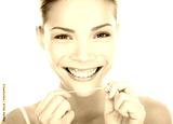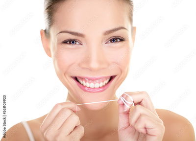 Dental floss - woman flossing teeth smiling happy with perfect teeth and toothy smile. Dental care concept with beautiful multiracial Asian Caucasian female model isolated in transparent PNG.