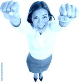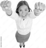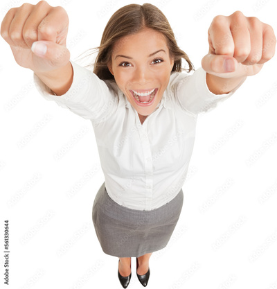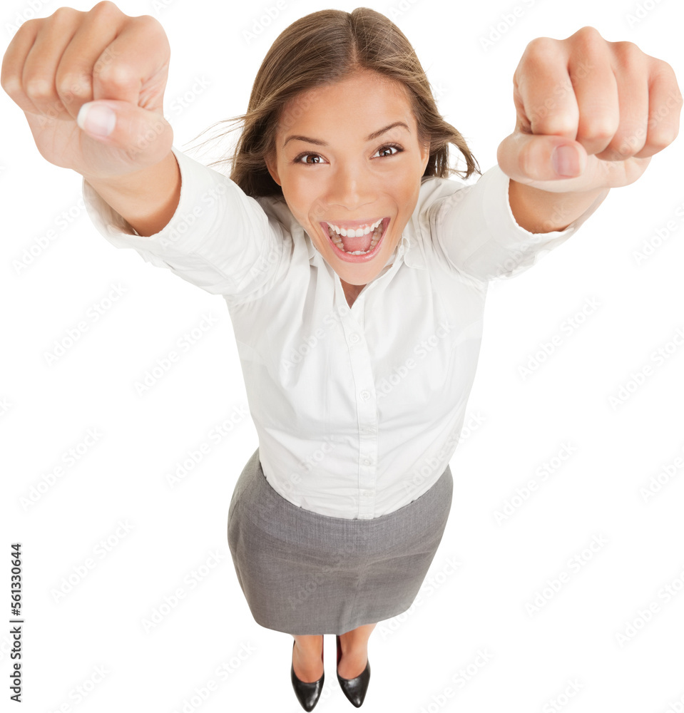 Happy jubilant you woman cheering. Fun high angle perspective of a vivacious jubilant you woman cheering and raising her clenched fists arms to the camera in her excitement isolated PNG.