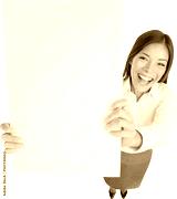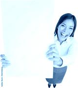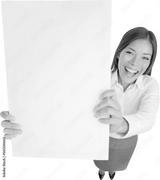 Businesswoman with blank sign excited. Fun high angle perspective of young happy cheerful businesswoman holding up blank sign for your attention with copyspace for advert or text. Isolated PNG.