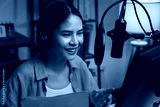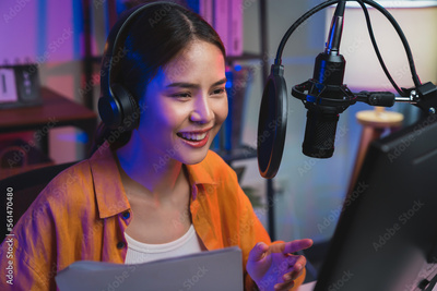 Cheerful beautiful Asian woman wearing headphones and using laptop record podcast at night. Content creator concept.
