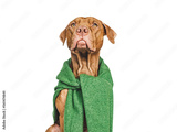 Lovable, pretty brown puppy. Isolated background. Closeup, indoors. Day light, studio shot. Concept of care, education and raising pet