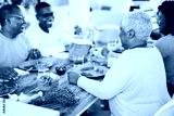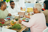 Happy african family eating lunch together at home - Focus on mother head