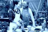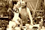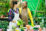 Multiracial women working inside green glasshouse garden market - Focus on senior african female face