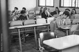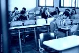 Young multiethnic students working together inside classroom at school university - Focus on blond girl face