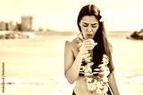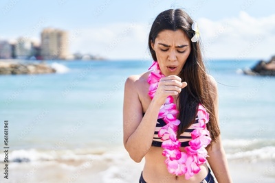 Young brunette woman wearing bikini at the beach feeling unwell and coughing as symptom for cold or bronchitis. health care concept.
