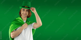 Young man celebranting St. Patrick's Day. Portrait of guy Prep Student with long hair wearing green Leprechaun hat and green cape