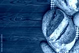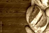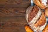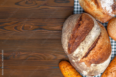 Homemade freshly baked bread. Wood rustic table, board. Bakery and baked goods bars, baguette, buns, rolls, biscuits and loaf breads, cookies, cakes, cheesecakes, muffins. Top view, copy space