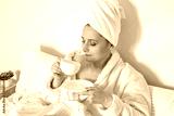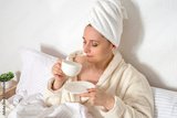 Woman drinking coffee or tea breakfast in bed at home or hotel in the morning. Lady wrapping a towel around head. Girl wearing bathrobe on clean white bedding, cozy blanket. Healthy lifestyle