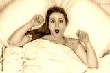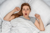 Woman just waking up and stretching in bed at home in the morning. Rested and relaxed happy Lady with long hair in pajamas. Girl on clean white bedding with cozy blanket. Healthy lifestyle, wellness