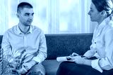 Session with a psychologist, psychotherapist. Young depressed male patient and professional female doctor with note pad. Lifestyle. Mental health care