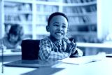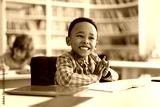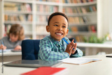 Happy african american primary school boy sitting at desk in classroom, writing in notebook and smiling, free space