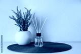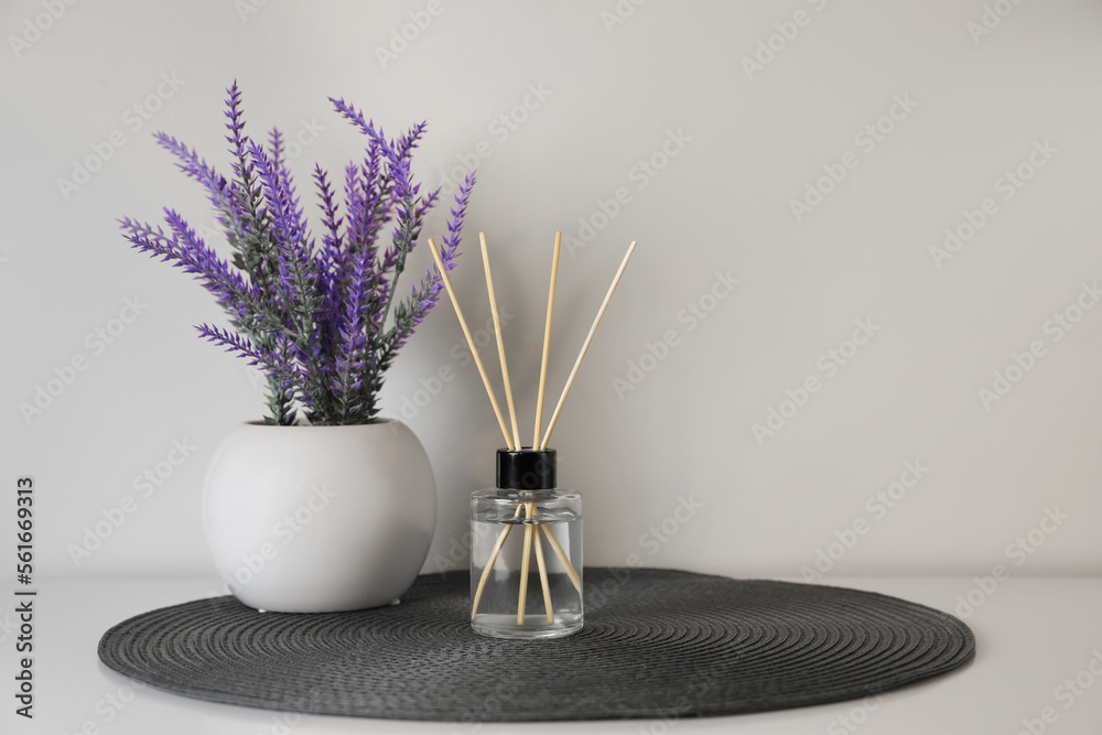 Aromatic reed air freshener and lavender flowers on white table. Space for text