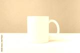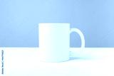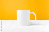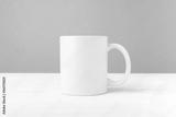 White ceramic mug with blank copy space front view. Cup mockup for advertising and logo on a wooden table.
