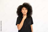 Portrait of displeased young woman touching throat over white background. Biracial lady with afro hairstyle wearing black T-shirt suffering from tonsillitis. Diseases concept