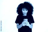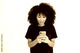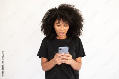 Portrait of excited young woman reading message on smartphone over white background. Biracial lady with afro hairstyle wearing black T-shirt using mobile phone. Mobile communication concept