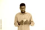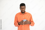 Portrait of concentrated young man plying mobile phone over white background. African American guy wearing orange shirt reading or texting message. Mobile technology concept