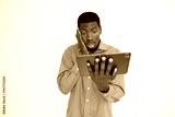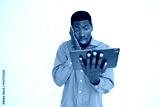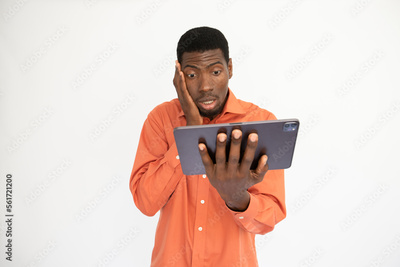 Portrait of worried young man reading news on digital tablet over white background. African American guy wearing orange shirt looking at touchpad in anxiety. Wireless technology and anxiety concept