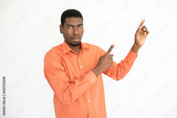 Portrait of confident young man pointing aside over white background. African American guy wearing orange shirt advertisng something and looking at camera. Promotion concept