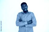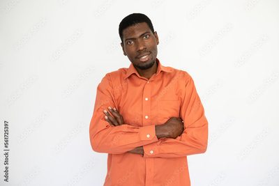 Portrait of happy young man posing with folded arms over white background. African American guy wearing orange shirt looking at camera and smiling. Confidence concept