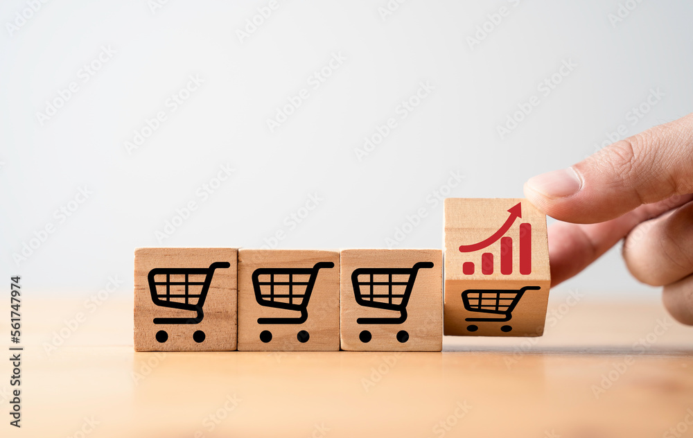 Hand flipping change between increasing graph and shopping cart trolley which print screen on wooden block cube for commerce business sales and order growth concept.